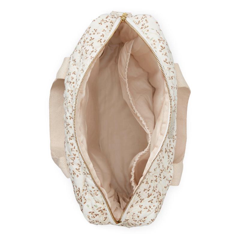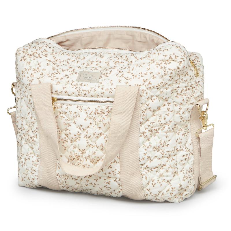Вместительная сумка с множеством карманов, которая не выглядит как типичная "мамская" сумка. Принт с плющом деликатный, стёганая текстура добавляет структуру, а бежевый оттенок легко сочетается с любой одеждой. Внутри продуманная организация пространства: отделения для бутылочек, подгузников, влажных салфеток. Качественная фурнитура и прочные ручки выдерживают нагрузку. Можно использовать как повседневную сумку даже после того, как малыш подрастёт.
