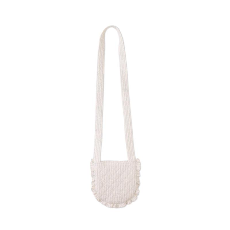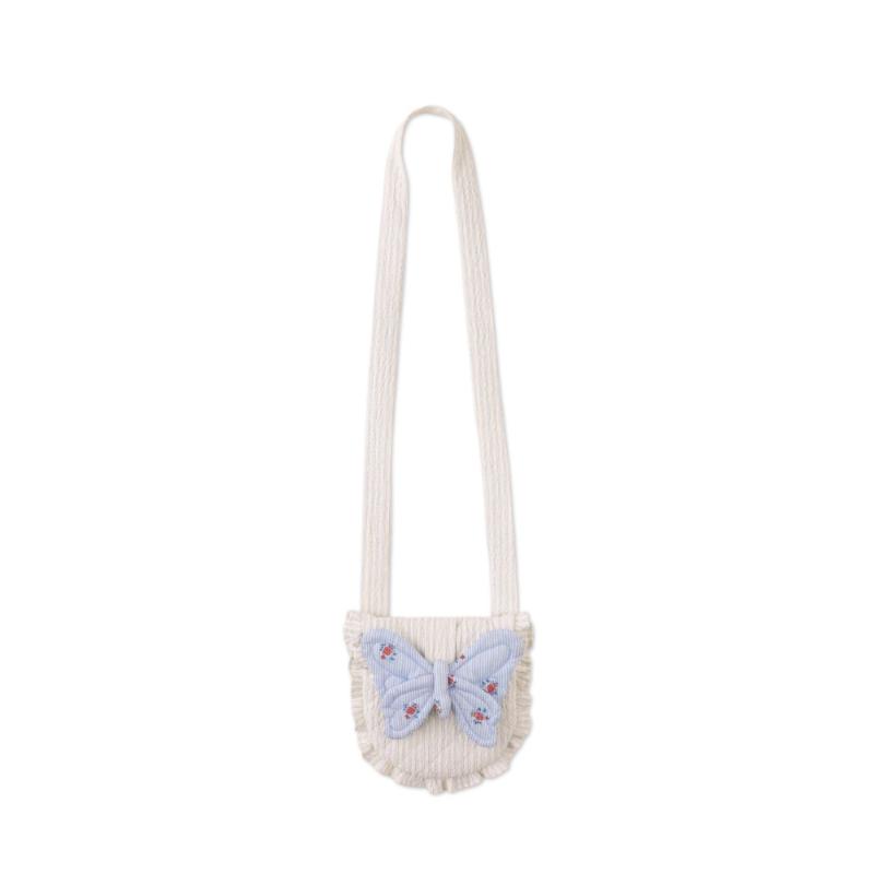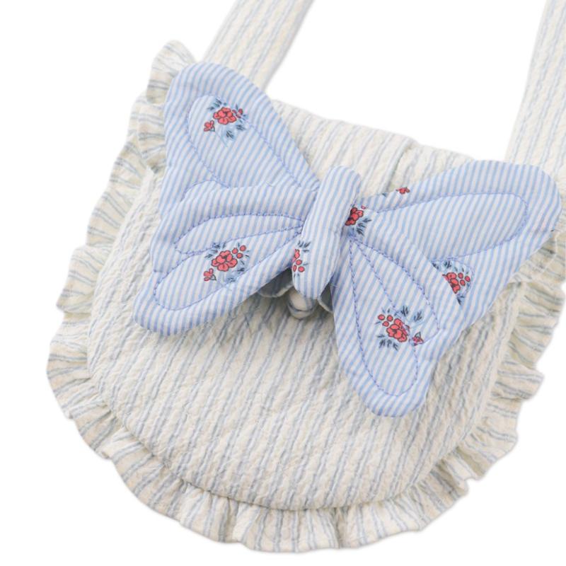 Сумка в голубую полоску дополнена декоративной заколкой в виде бабочки, что делает образ более выразительным. Удобный размер позволяет взять с собой необходимые мелочи. Полосатый рисунок добавляет легкости и хорошо сочетается с летними образами.
