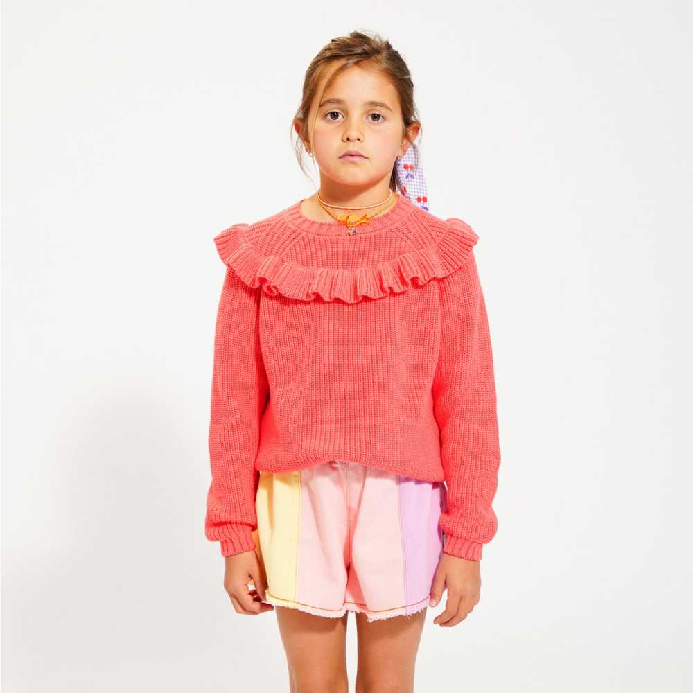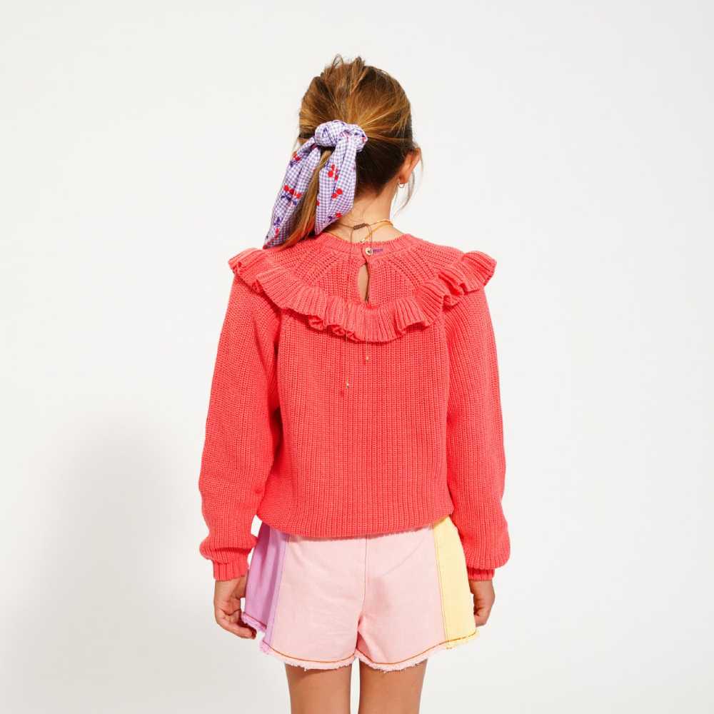 Очаровательный свитер с рюшами в нежном розовом цвете станет любимым предметом в гардеробе каждой девочки. Вязаная структура делает свитер не только теплым и комфортным, но и невероятно стильным. Элегантные рюши на рукавах и воротнике добавляют ему уникальности, создавая легкий и модный образ. Он прекрасно сочетается как с джинсами, так и с платьем или юбкой, создавая стильные и уютные образы для любого случая — от прогулок по парку до визитов в кафе и на встречи с друзьями.