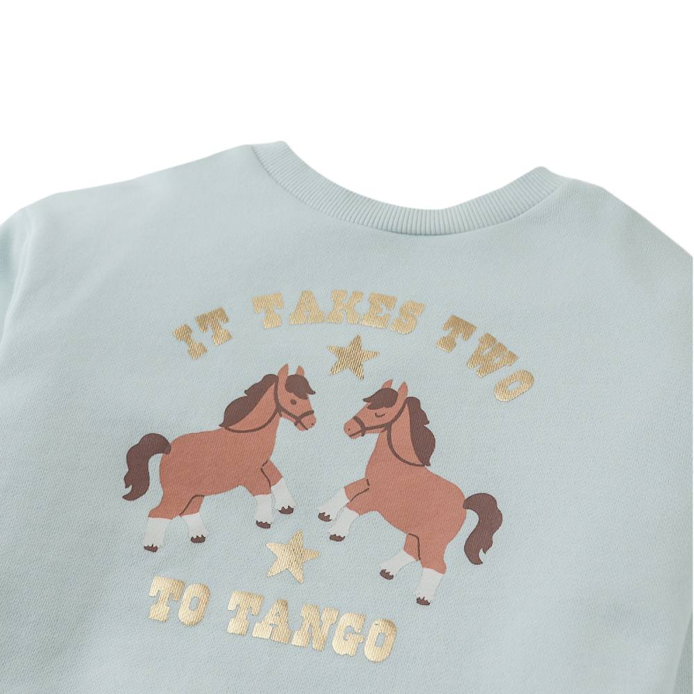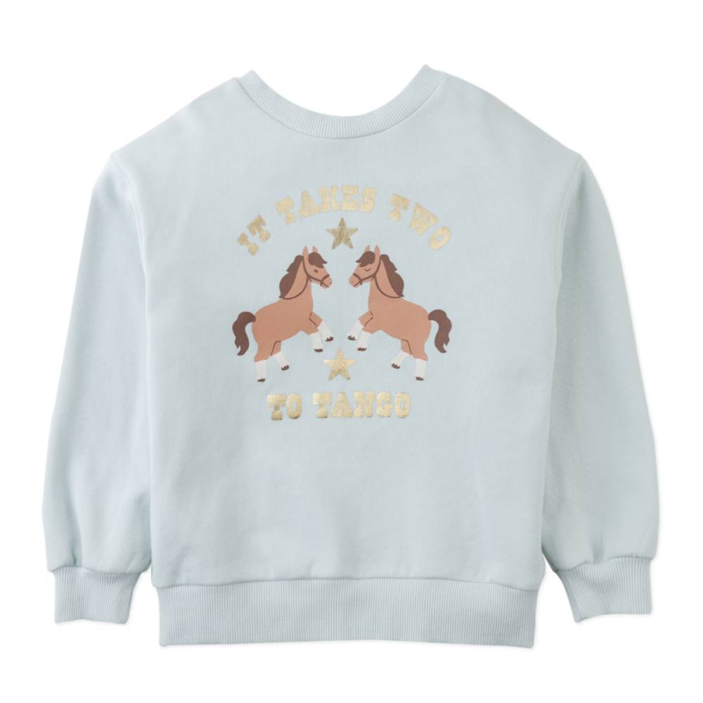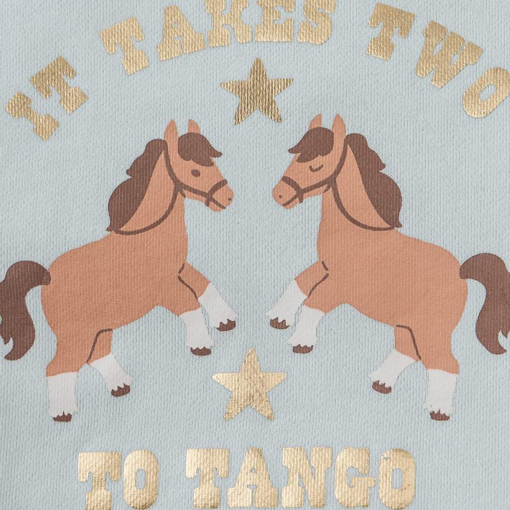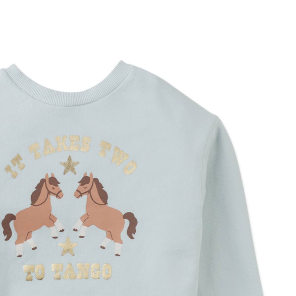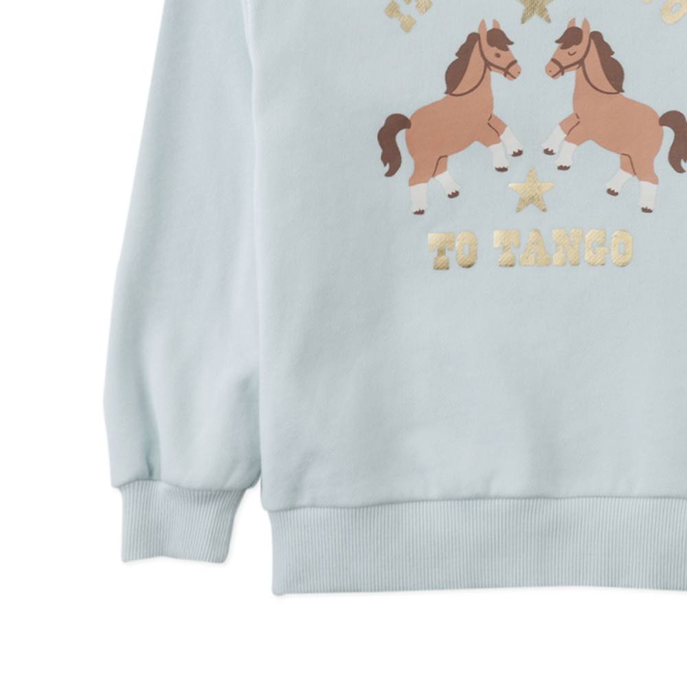 Свитшот Gingersnaps небесно-голубого цвета с забавным принтом и подвижной бахромой. Надпись «It Takes Two to Tango» остроумно дополняет дизайн, делая его по-настоящему уникальным. Этот свитшот станет любимой вещью для прогулок, игр и встреч с друзьями, даря комфорт и отличное настроение.