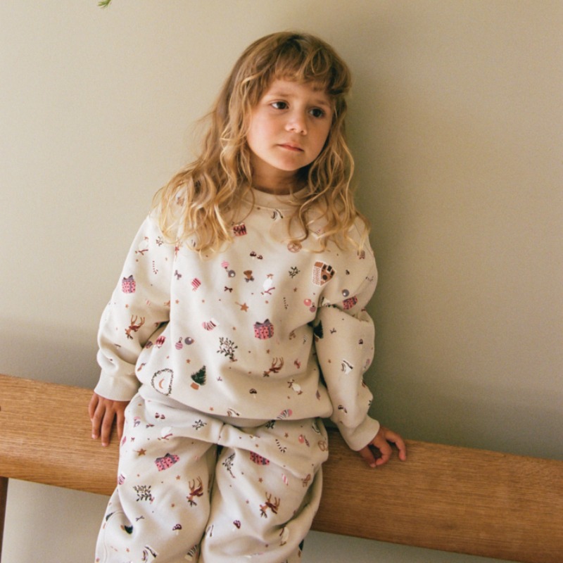 Свитшот с праздничным принтом — шарики, звёздочки и ёлочные игрушки в минималистичной манере. Изготовлен из мягкого органического хлопка, с удобной посадкой и удлинённой спинкой. Идеален для утренников, семейных фото и зимних прогулок. С ним даже самый обычный день становится немного праздничным.