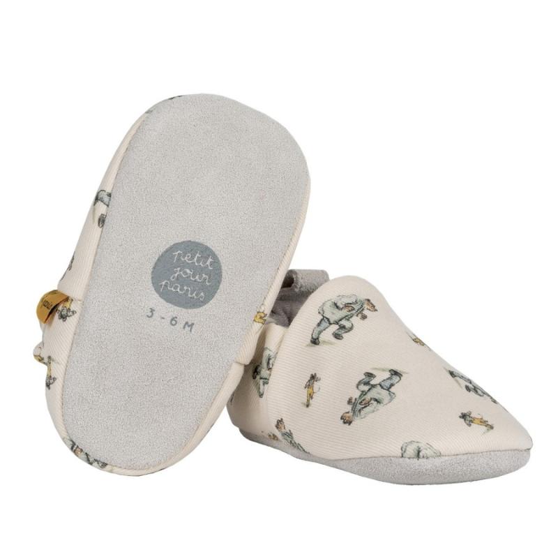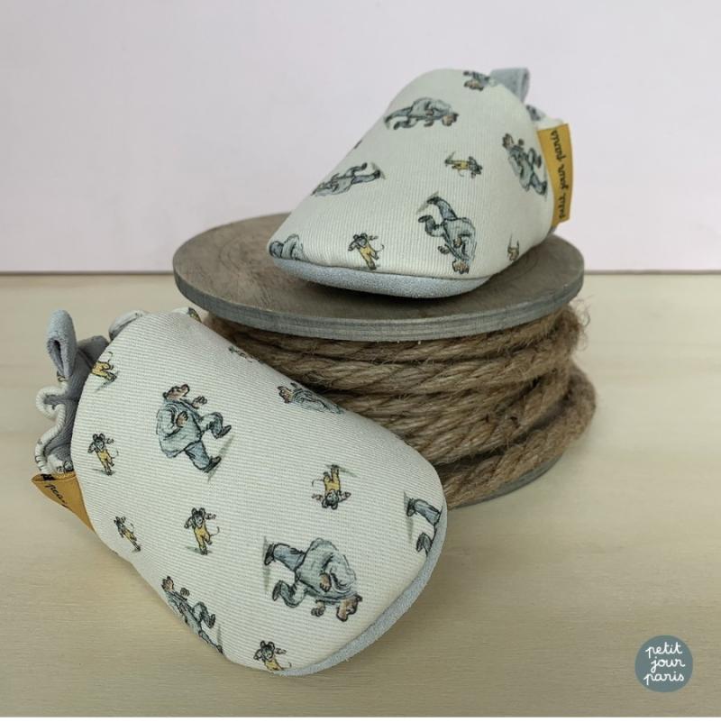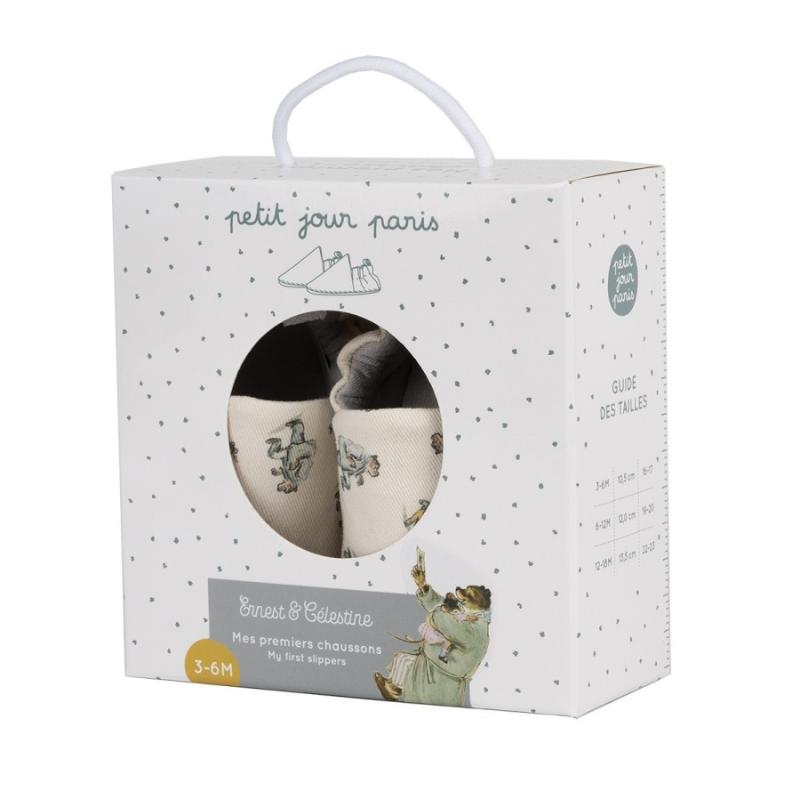Мягкие тапочки из ткани с рисунками медведя Эрнеста и мышки Селестины для самых маленьких. Серый цвет спокойный, подходит всем. Тапочки держатся на ноге благодаря мягкой резинке. Подошва не скользит по гладкому полу. Ткань приятная, не натирает нежную кожу. Тапочки согревают ножки дома в прохладную погоду. Легко надевать и снимать. Можно стирать вручную или в машине на деликатном режиме. Милые герои делают тапочки интереснее для малыша.