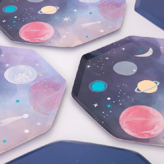 Кто сказал, что одноразовая посуда обязательно должна быть скучной и некрасивой? Вы только посмотрите на эти тарелки из набора Meri Meri. Они идеально подойдут для космической вечеринки и помогут вам произвести неизгладимое впечатление на гостей. Тарелки имеют необычную восьмиугольную форму и изготовлены из качественной экологически чистой бумаги. Своим ярким принтом они поднимут настроение всем окружающим, независимо от их возраста, и позволят с головой погрузиться в таинственный мир космоса.