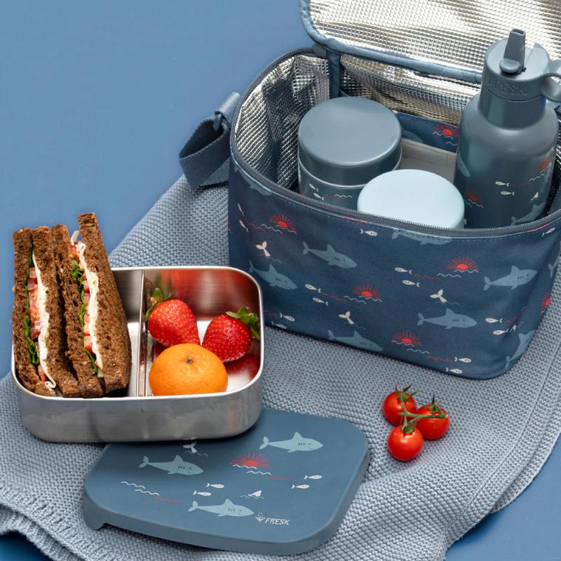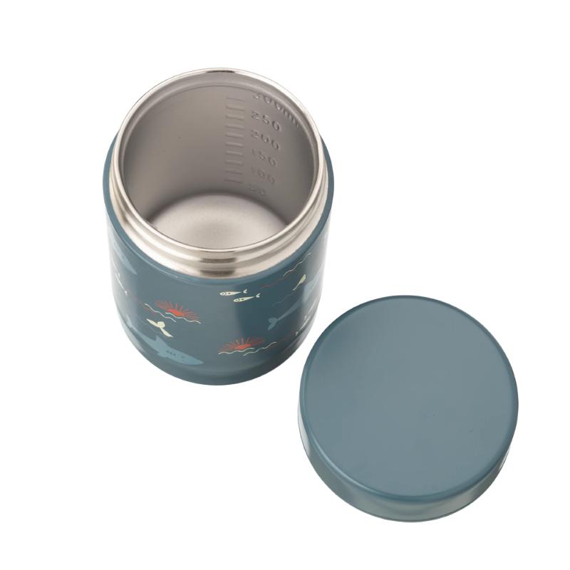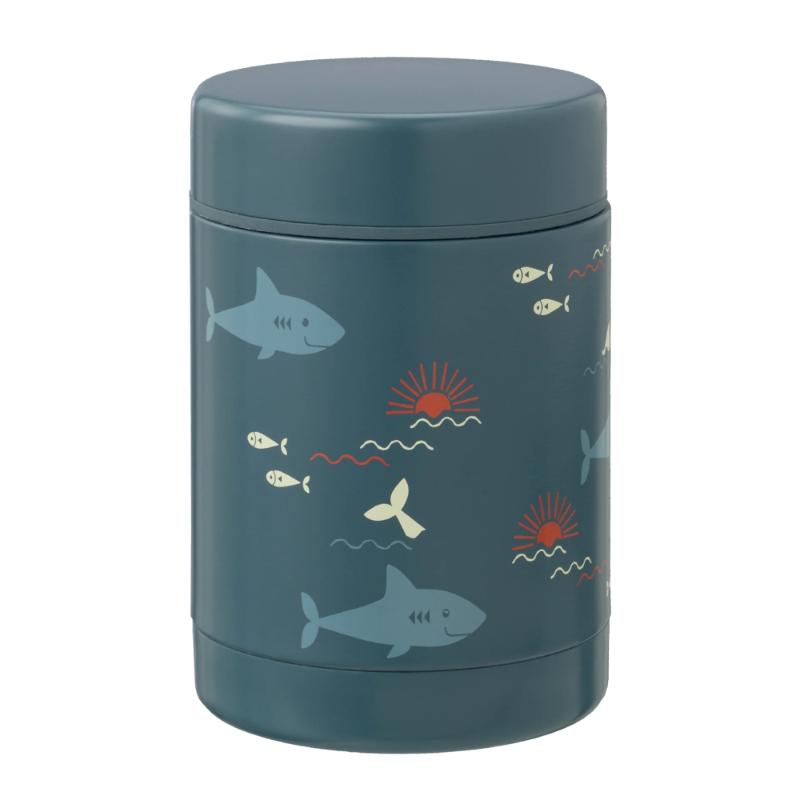 Улыбающиеся акулы на голубом фоне развеивают все страхи перед морскими хищниками и делают обед веселее. Вакуумная изоляция работает в обе стороны: горячее остаётся горячим, холодное — холодным. Широкое горло позволяет класть внутрь даже крупные кусочки, а не только пюре. Компактный размер — это баланс между сытной порцией и разумным весом рюкзака. Качество сборки типично для голландского бренда: никаких протечек и быстрых поломок.