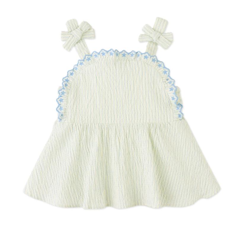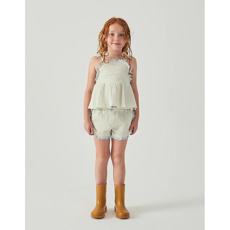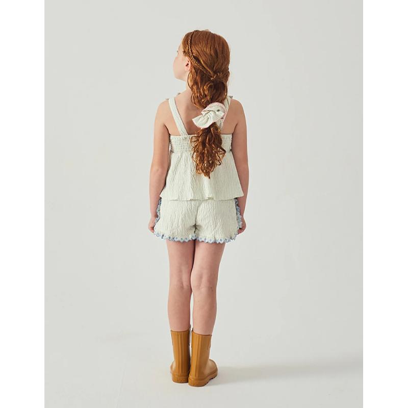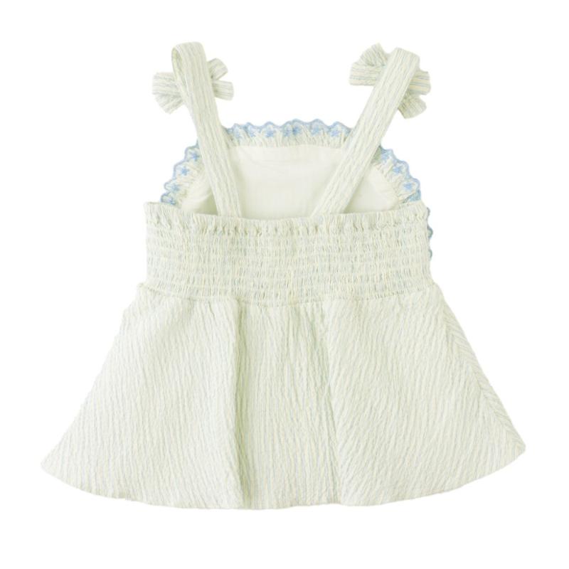 Топ-фартук в бледно-голубом оттенке выглядит аккуратно и свежо. Открытая линия плеч и продуманный крой создают легкий силуэт, который красиво смотрится в движении. Завязки позволяют регулировать посадку, обеспечивая комфорт в течение дня. Модель хорошо сочетается с юбками, шортами и брюками, собирая спокойные летние образы.