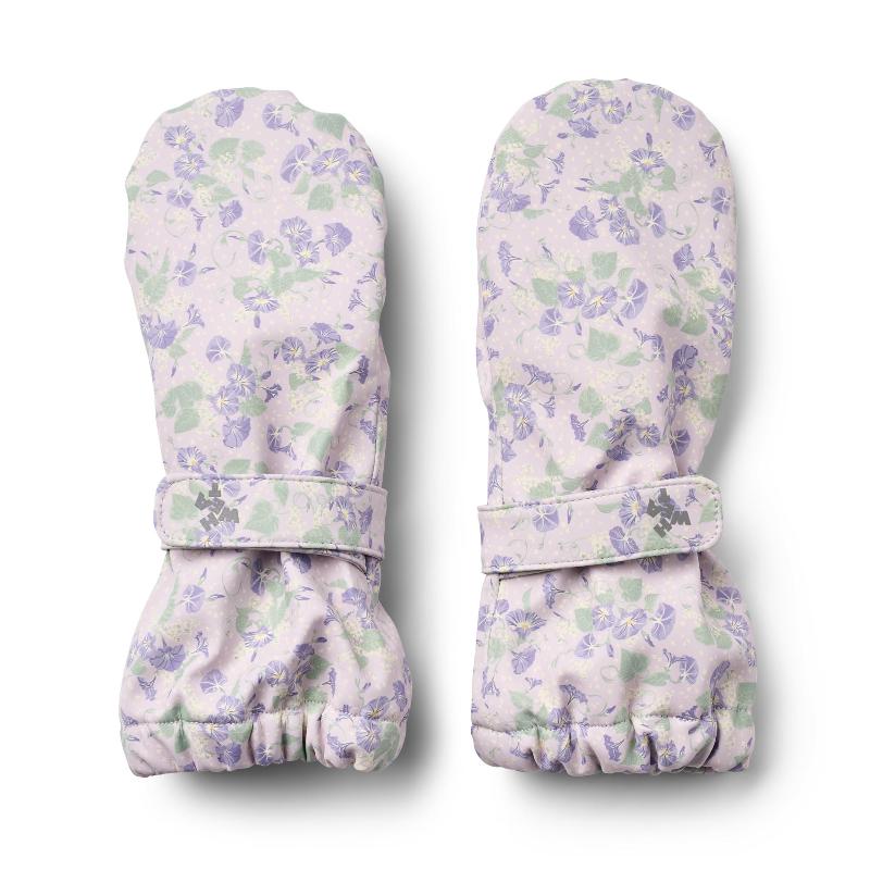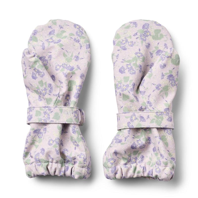 Непромокаемые варежки фиолетового цвета с петуниями. Внутри мягкий флис согревает пальцы. Застежка-липучка вокруг запястья держит варежку на руке. Резинка выше запястья не пропускает холод и воду. Водоотталкивающая поверхность защищает от дождя. Для весны и осени в сырую погоду. Удобно застегивать даже малышам. Можно играть в мокром песке без опаски промочить руки. Сочетаются с курткой и брюками из коллекции бренда.