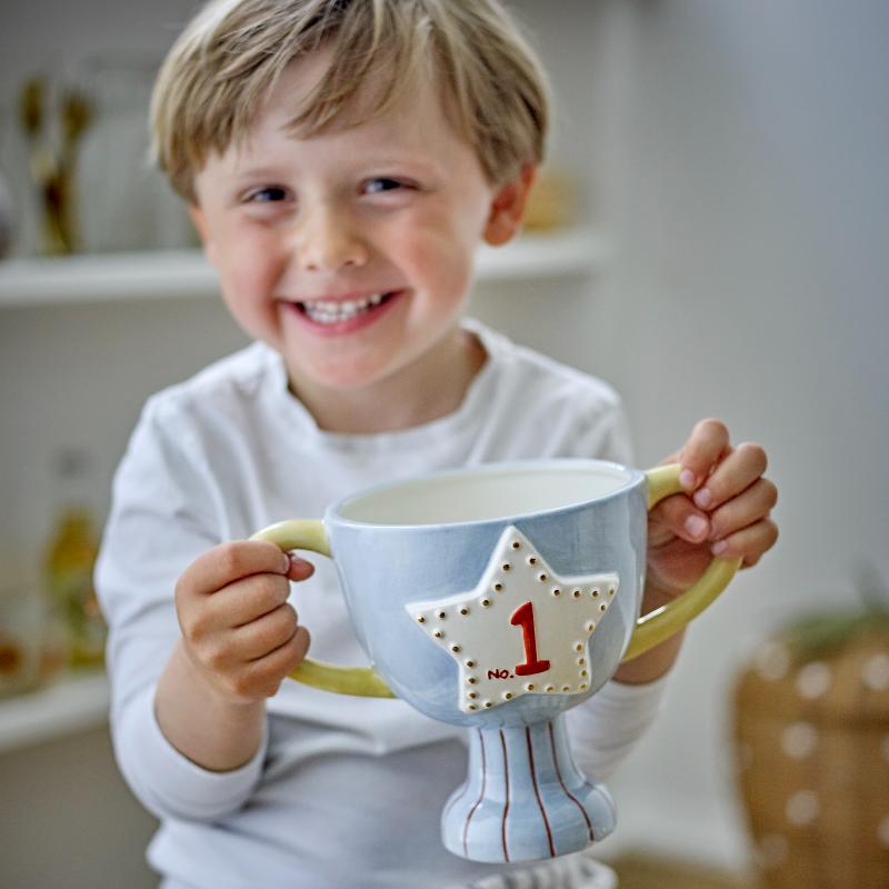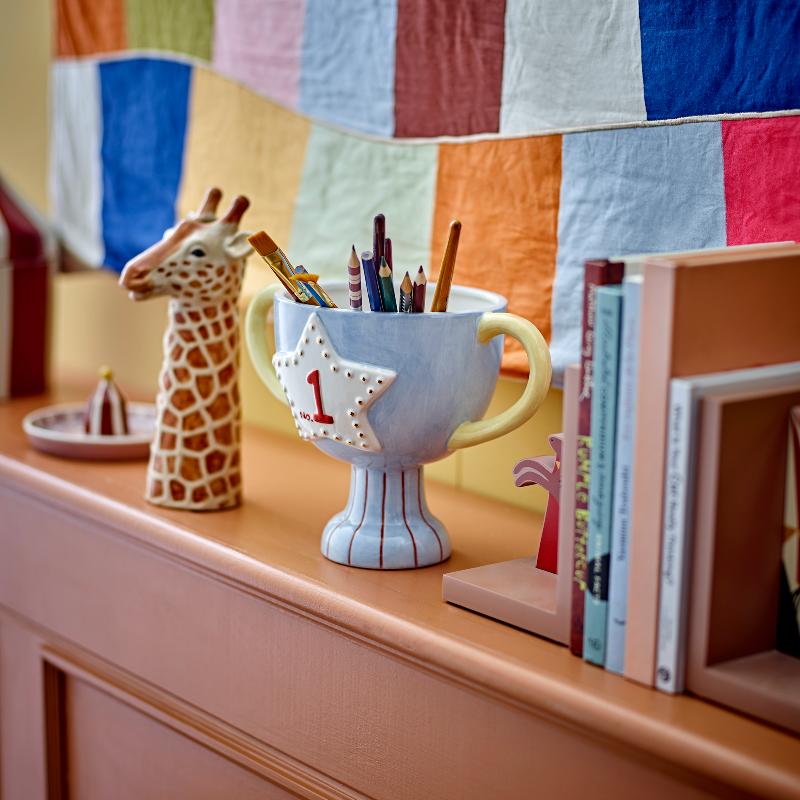 Ваза-трофей для самых важных полевых цветов. Голубая керамика в форме наградного кубка добавляет игровой элемент в детскую комнату. Можно поставить букет одуванчиков от бабушки или использовать как необычный органайзер для карандашей. Керамика прочная и устойчивая. Этот маленький приз напоминает, что каждый день достоин награды — даже если просто собрал игрушки перед сном.