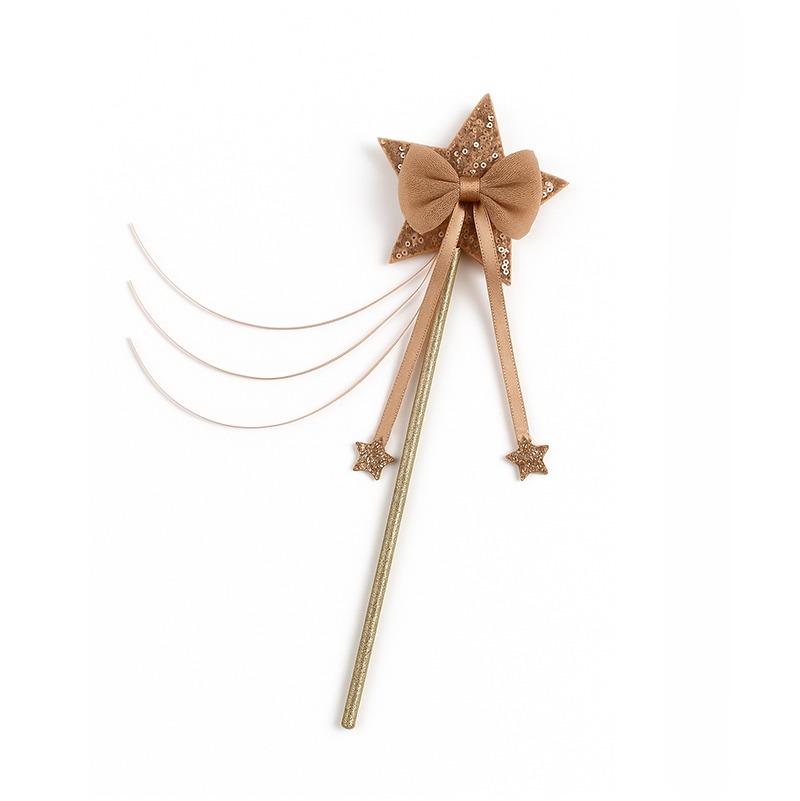 Волшебная палочка со звездой, украшенной золотисто-розовыми пайетками. Сверху пышный помпон из тюля в шоколадных тонах, ниже свисают атласные ленты. Палочка обмотана золотой блестящей лентой, которая удобно лежит в руке. Отлично подходит для игр в фею или бабочку. Можно сочетать с крыльями и юбкой из этой же коллекции.