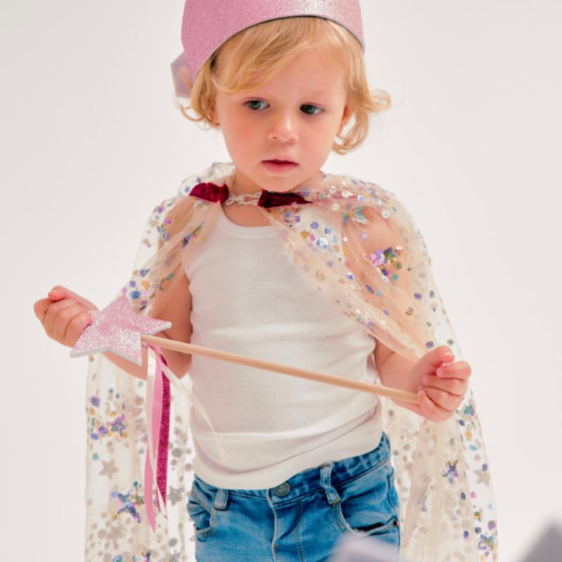 Яркая волшебная палочка с разноцветными лентами и звездой на конце. Легкая деревянная основа удобно лежит в детской руке. Атласные ленты развеваются при каждом взмахе, создавая визуальный эффект заклинания. Прочная конструкция выдерживает активные игры без поломок. Палочка подходит для ролевых игр, танцев и домашних представлений. Это не хрупкий декор, а настоящий игровой инструмент для развития фантазии.