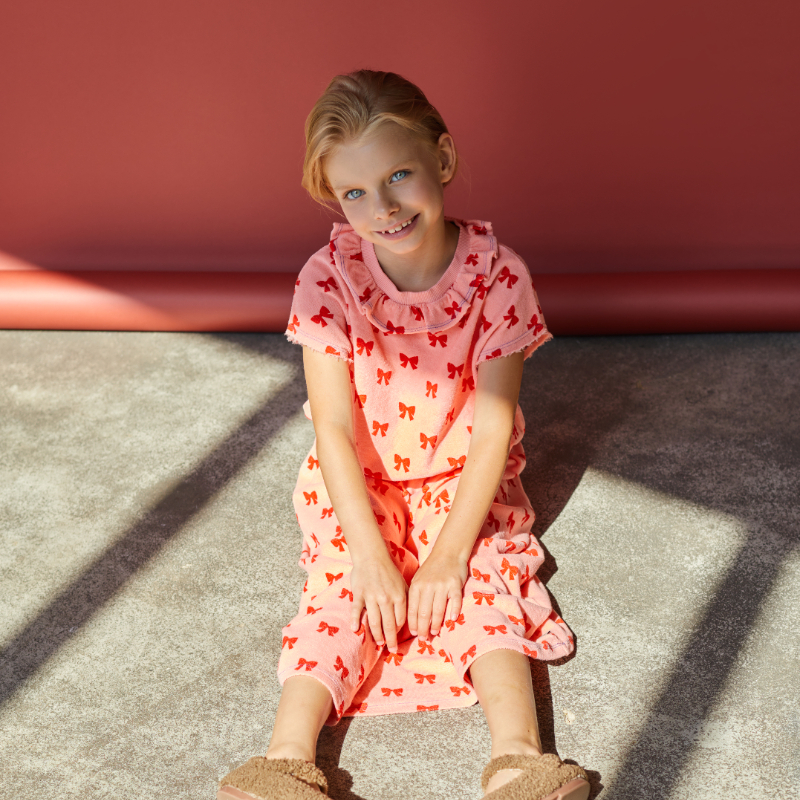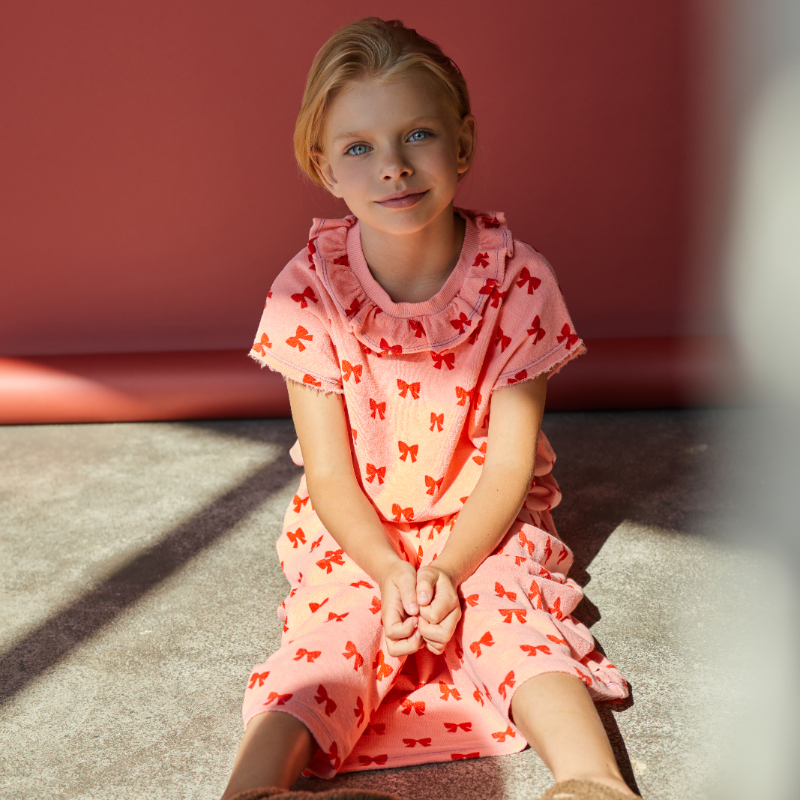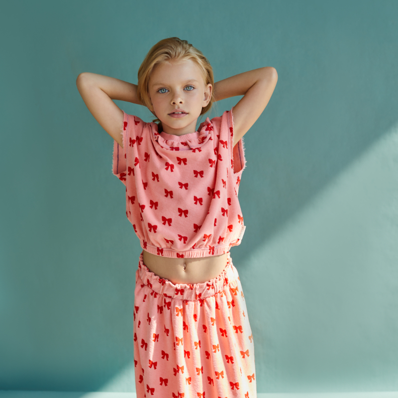 Юбка из плюшевой ткани с красными бантиками на розовом фоне — это идеальный выбор для летнего гардероба. Мягкая и комфортная, она позволяет ребенку чувствовать себя свободно, в то же время создавая уникальный и стильный образ. Юбка прекрасно сочетается с топами и блузами, а также станет прекрасным элементом как для прогулок, так и для игр на свежем воздухе.