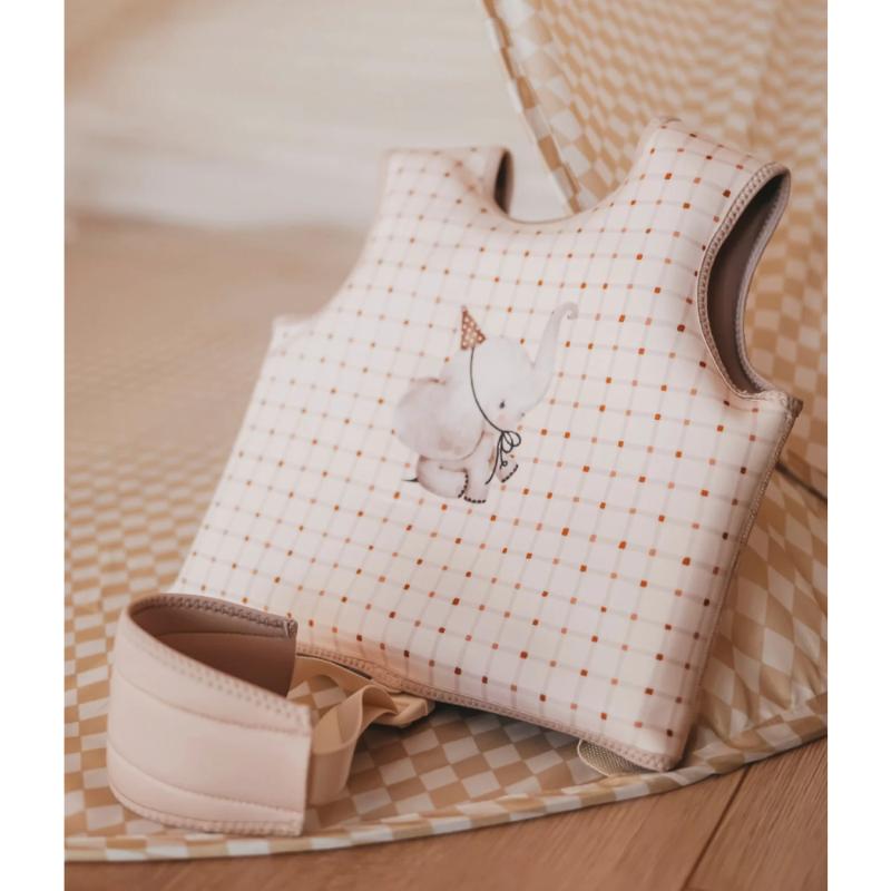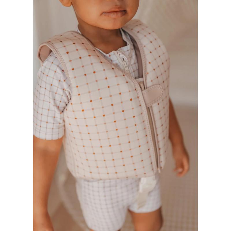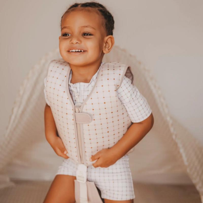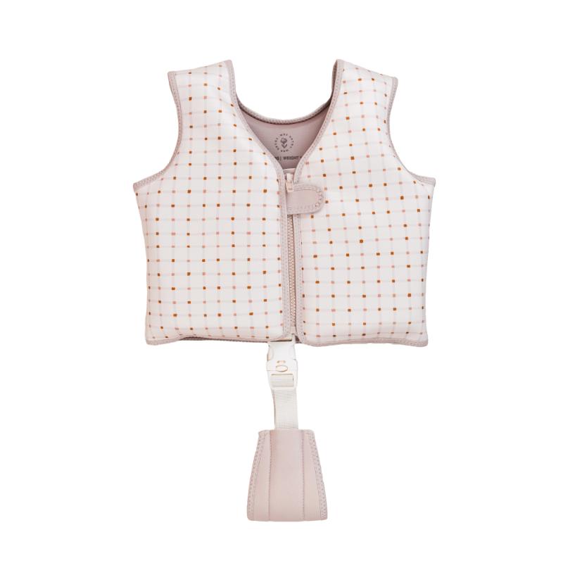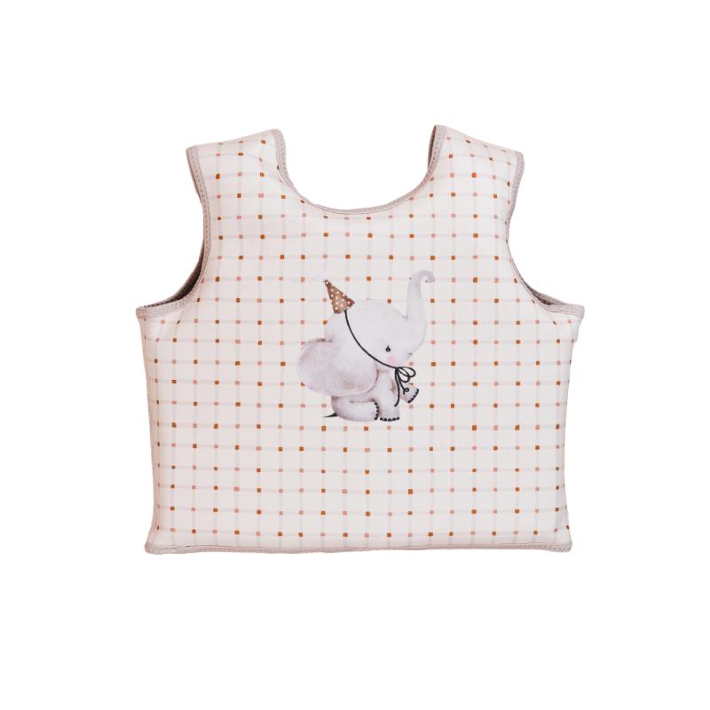 Неопреновый жилет с пенопластом внутри для поддержки на воде. Не нужно надувать — всегда в рабочем состоянии. Регулируется по размеру с помощью ремешков на спине. Даёт ребёнку уверенность в воде при обучении. Внимание: это вспомогательное средство для тренировок, не заменяет спасательный жилет. Всегда следите за ребёнком. Геометрический узор смотрится стильно.