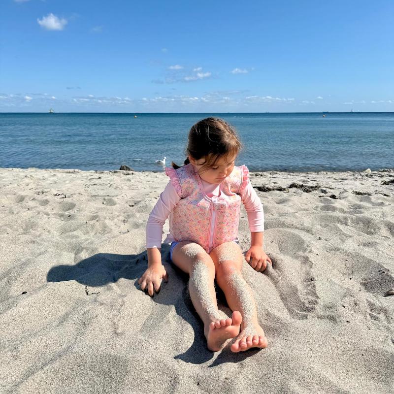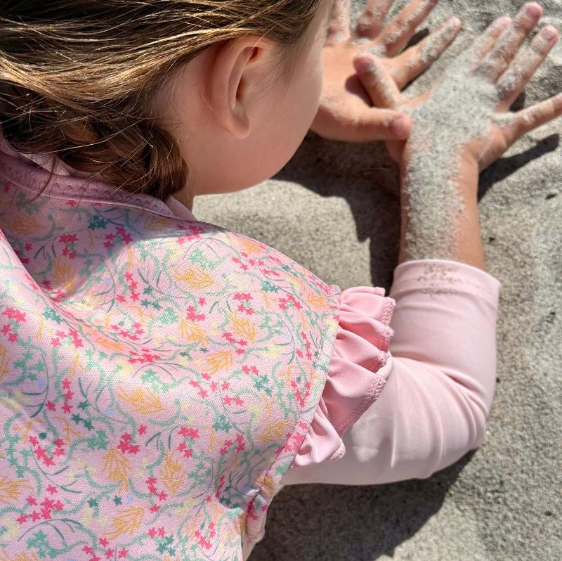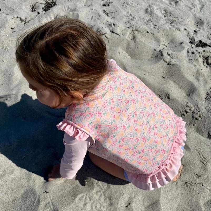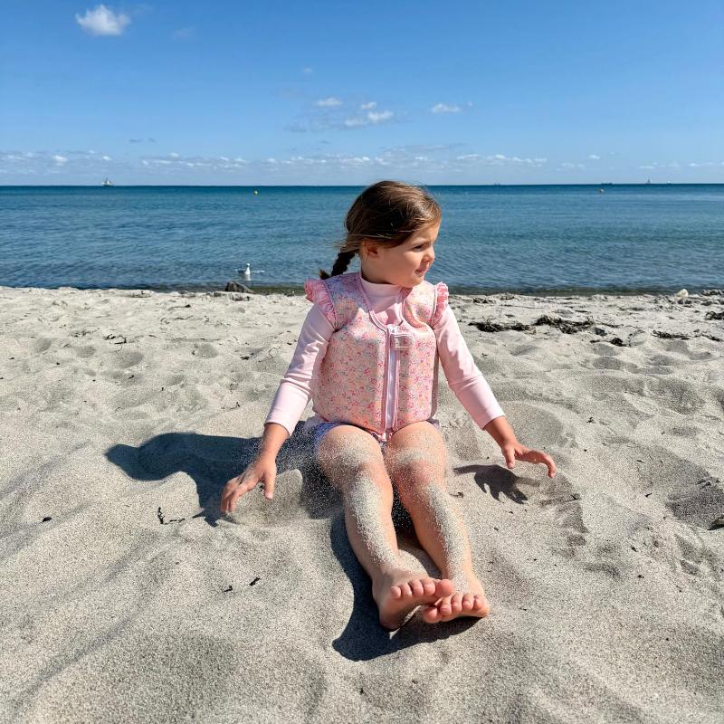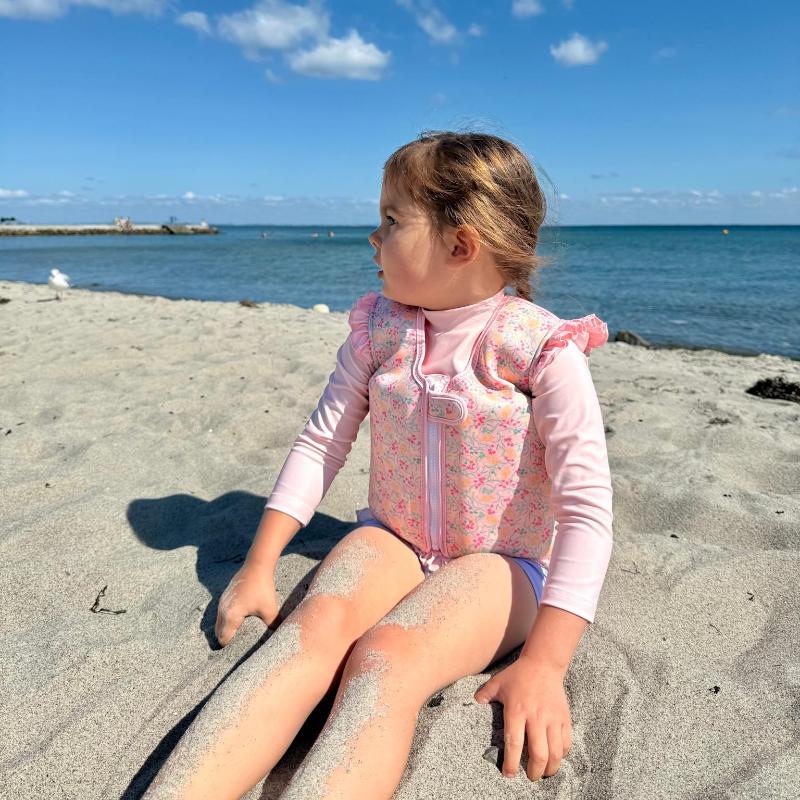 Жилет с цветочным рисунком на розовом фоне создаёт летнее настроение и помогает ребенку чувствовать себя увереннее у воды. Он поддерживает корпус, не ограничивая движения рук, и подходит для игр и первых попыток плавания. Внутри жилета расположены пенопластовые вставки, создающие легкую плавучесть — их можно постепенно убирать, когда ребёнок становится более уверенным в воде.