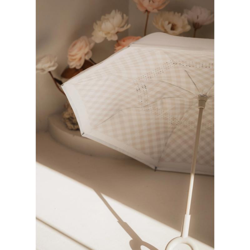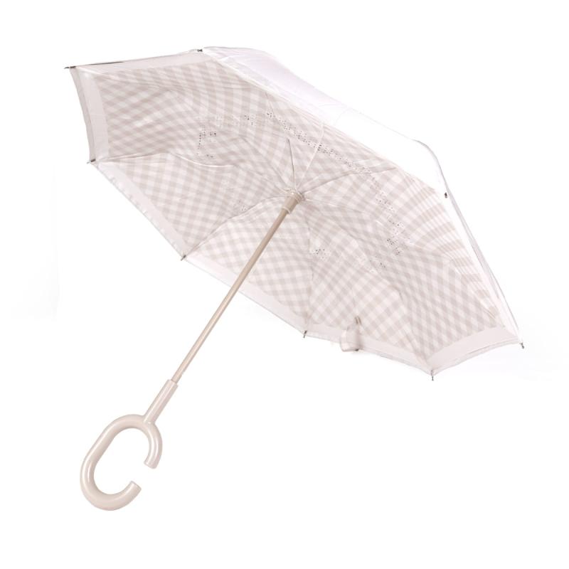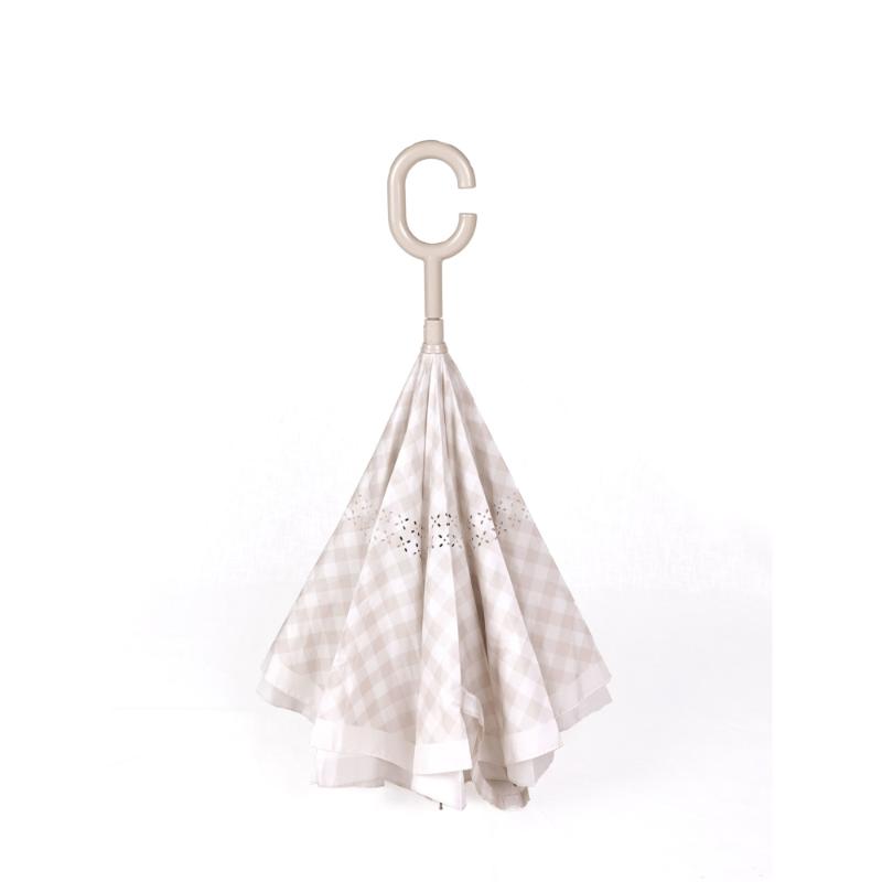 Элегантный зонт в кремовую клетку виши диаметром 90 см. Обратный механизм – настоящая находка: вода остается внутри при закрывании, одежда остается сухой. Экстра-прочная рама из стали и карбона не боится резких порывов. Переработанный полиэстер с защитой UV+50 подходит для любой погоды. Скрытый каркас обеспечивает безопасное использование без риска прищемить пальцы. Можно ставить вертикально для быстрой сушки. Универсальный размер для семейного использования. Классический принт вне моды и времени.